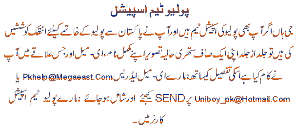 Yasir Rauf nay polio vaccination ka kaam jab wo (1996) mein 6th class mein thay jab say shuroo kiya. Aaj in ko kaam kartey hoeay nau ( 9 ) saal ka arsa guzar chuka hai, aur yeh ab bhi mulk say polio k khatmay k liye giran-qadar khidmaat anjam de rahe hein. Dilchasp baat tou yeh hai k 2003 mein in k saath aik hadsa paish aaya jis mein in ki taang par bhi chotein lageen lekin mulk say polio k khatmay k liye inhonay apnay taang mein lagnay wali chot ki parwah na kartey hoeay polio vaccination ghar ghar ja kar ki. In ki is behtareen kar kardigi par www.poliofreepakistan.4mg.com ki taraf say best wishes. Allah in ko yeh naik kaam jab tak mulk say polio ka khatma nahin hojata kar nay ki taufeeq ata farmaye "Aameen".    violinsonata12@hotmail.com